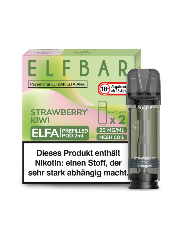 Die ElfBar ELFA Pods sind befüllte Closed Pods, sie dienen als Ersatzpods für das ELFA Pod Kit System. Die Einwegpods haben einen Nikotingehalt von 20mg/ml. Der 2ml große Liquidpod ist komplett befüllt und ermöglicht, je nach Zugverhalten, ca. 600 Züge. Dies entspricht in etwa 60 Tabakzigaretten, wenn man davon ausgeht, dass an einer Zigarette 10 mal gezogen wird. Wenn das Liquid leer ist dann können sie den Pod einfach gegen einen neuen Pod austauschen, sie müssen nichts nachfüllen oder einstellen. Durch eine magnetische Verbindung hält der Pod super in der Vape. Daher ist es auch für Einsteiger geeignet. In diesen Pods ist ein Mesh Coil Verdampfer verbaut und er hat eine 3-Zug Kindersicherung.